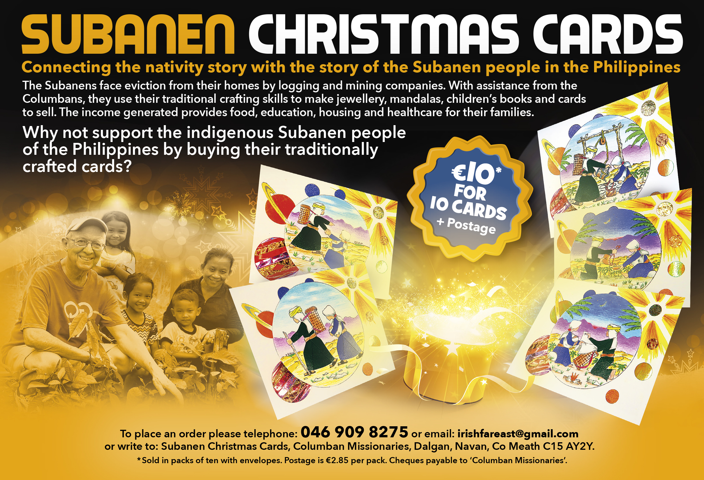 Write to: Subanen Christmas Cards, Columban Missionaries, Dalgan Park, Navan, Co Meath, C15 AY2Y. Cheques payable to Columban Missionaries.