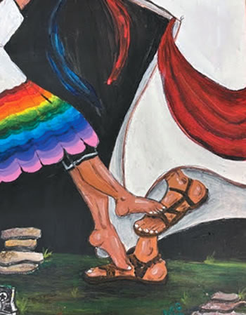 A third example of art expressing faith is a simple but beautiful picture one of our LGBTQ parishioners painted and shared with the parish. In it are two large feet in sandals dancing, with a small girl dancing with her feet on top of those feet. She had a dream of dancing with Jesus, a beautiful dream. Anyone could have it. But she had the rainbow colors in her dress. Many people saw it and were very moved. Surely, Jesus could see her rainbow colors and know who she is, and at the same time was very joyful to have her dance with him. For people who often feel rejected and excluded by many the joy and lightness this picture expresses brings a smile to those who see it. Art expressing faith (and hope). “Jesus is happy to dance with me and I with him!”